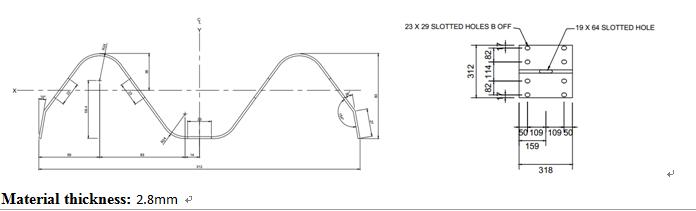Based on the highway W-beam needs, the guardrail roll forming machine was developed. By the machine, we can make the guardrail in batch fully automatically. Here is one drawing profile of W-beam for your reference: